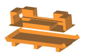 光学機器の梱包を積層段ボールで行いました、発砲ポリウレタンからのコストダウンができます。 外箱は浅いトレー式にして梱包しやすくしてあります。30kg程度の製品なので、積層桁をつけてあります。 ID: 7CBA