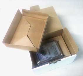 精密機器・部品用にプラスチックを使用せず、段ボールのみからなる緩衝体を開発しました。落下試験で対衝撃強さを従来の樹脂製エアクッションを凌ぐレベルを達成しました(加速度センサーで測定)。上下の緩衝体のみで挟む形態です。 ID:7A43