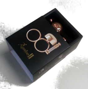 ウレタンベースの台に指輪状の製品をはめ込み固定します。箱は、板紙+つや消印刷+箔押で高級感がでます。シュリンクラップ包装して完成です