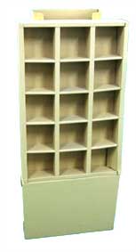 製品の陳列台です。4個縦に並ぶように、トレータイプの函に仕切りを折り込んで使用します (右端は仕切りをはずしてあります)。 ID:7BAE